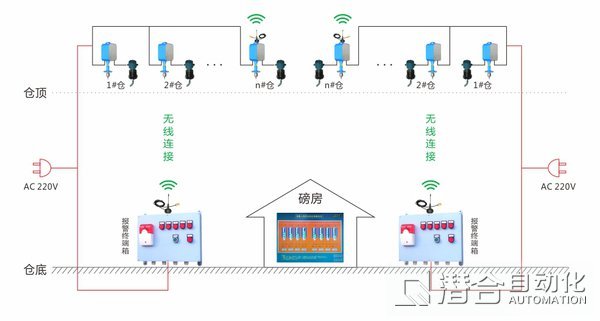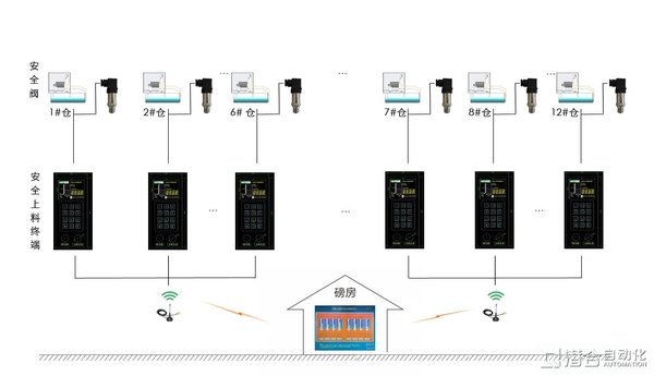 上料口側(cè):上料安全控制終端、電動(dòng)蝶閥,每個(gè)料倉1個(gè),各個(gè)終端通過網(wǎng)絡(luò)連接。
