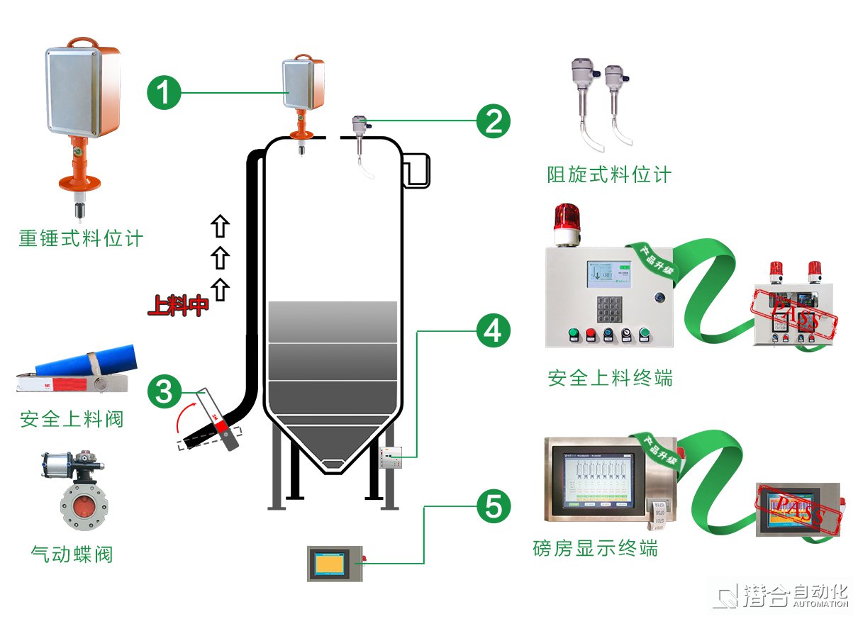 2、避免“打錯倉”引發(fā)建筑事故,潛合自動化研發(fā)的“檔桿閥”,通過電子鎖控制檔桿的手動開啟與關(guān)閉閉鎖;通過磅房觸摸屏集中控制系統(tǒng),完成閥門的實時開閉狀態(tài)監(jiān)控;通過磅房觸摸屏的動態(tài)密碼生成系統(tǒng),一次上料一個密碼;三位一體,確保物料的上料安全。